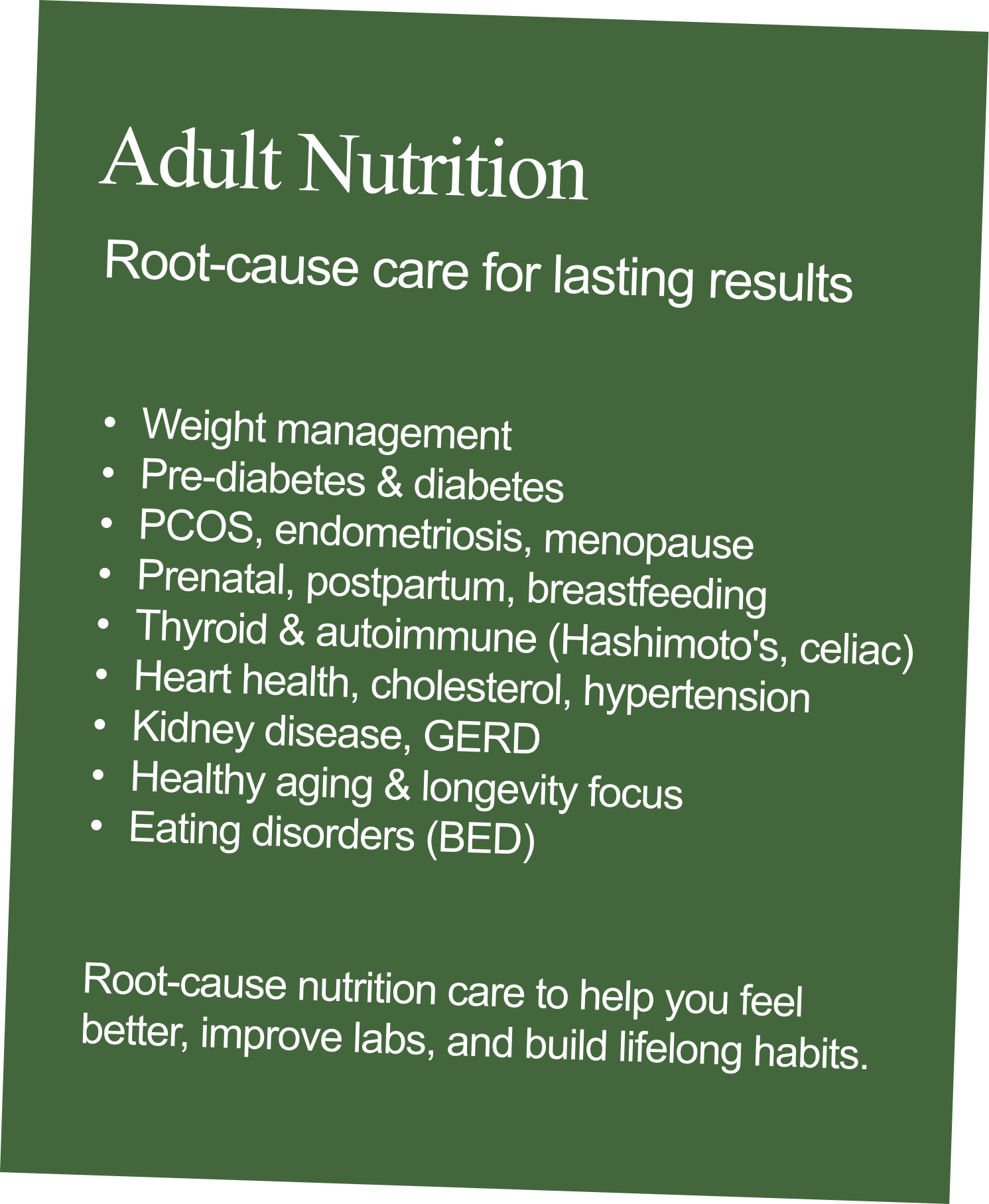 Whole-body, food-first, root-cause focused nutrition. I believe in sustainable habits, balanced nutrition, longevity, and building a confident relationship with food.